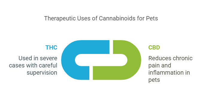 CBD enables the reduction of chronic aches and inflammation for pets that are not in dire conditions. In cases that are rare but severe, like cancer or terminal illness, THC may be used but with careful and recommended supervision because the risks are higher than the possible benefits.
