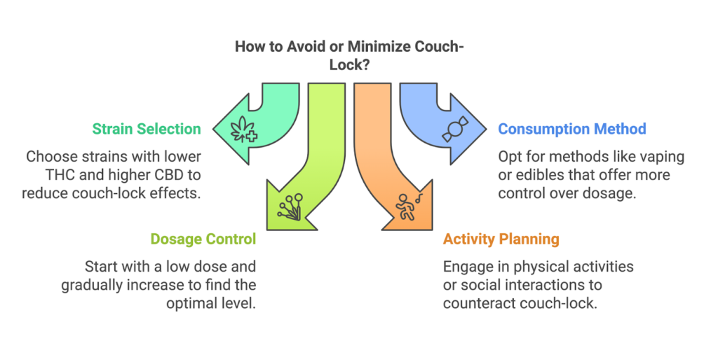 The likelihood of experiencing couch-lock increases when consuming cannabis with high THC levels or in larger amounts than your tolerance allows. Trying the following tips can help: