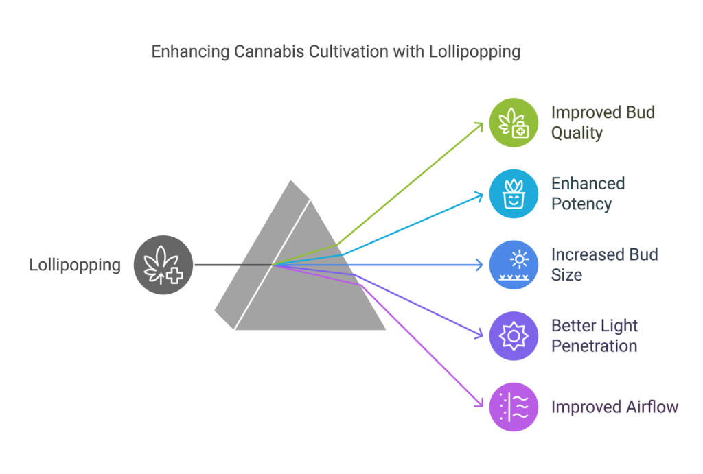 - Lollipopping boosts light penetration and airflow, enhancing bud quality and plant health.