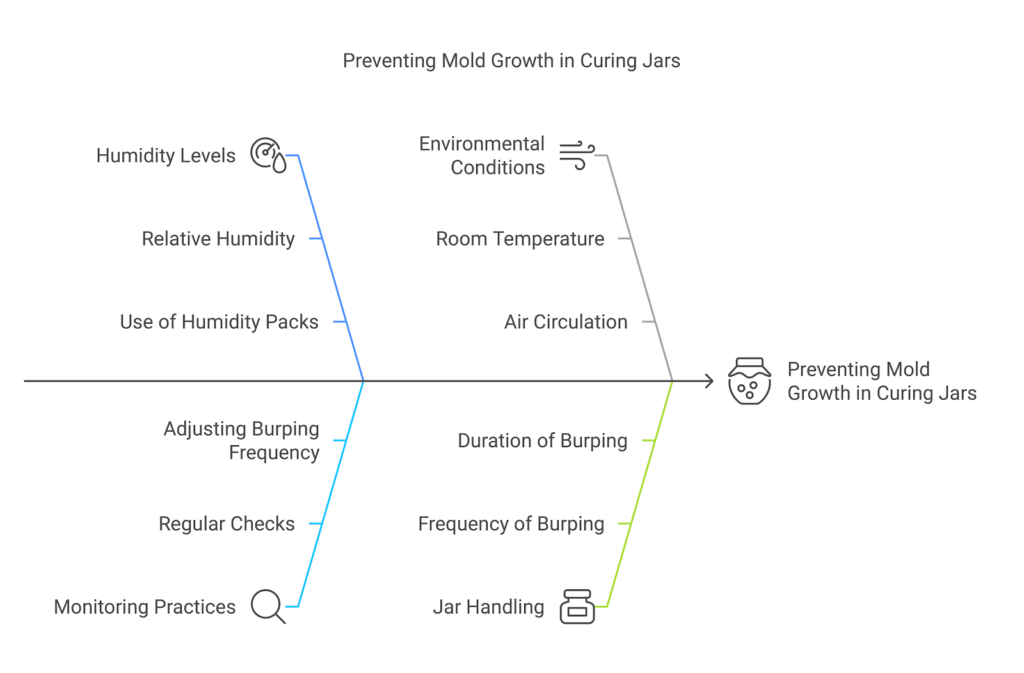 Mold thrives in environments with too much moisture. To prevent mold growth, aim for a relative humidity level between 59% and 63% in your curing jars.