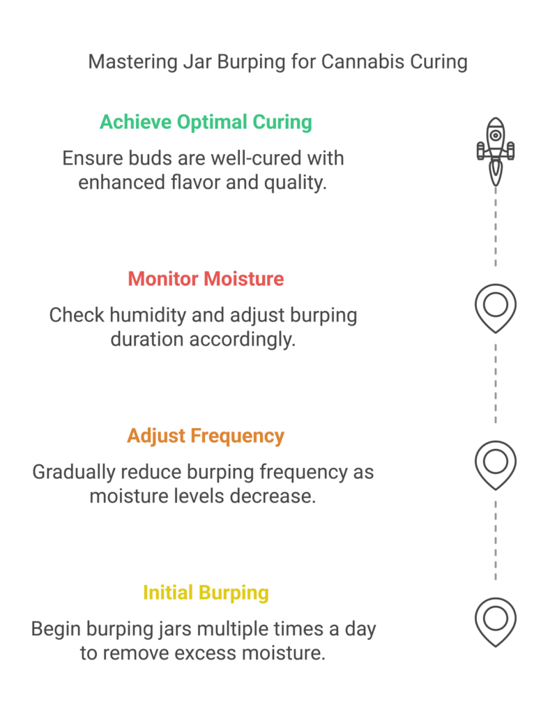 A number of variables, like the humidity level of your buds and the ambient conditions, affect how often and how long you burp. Burping your jars a couple of times a day is crucial during the initial stages of curing. This facilitates the rapid release of moisture.