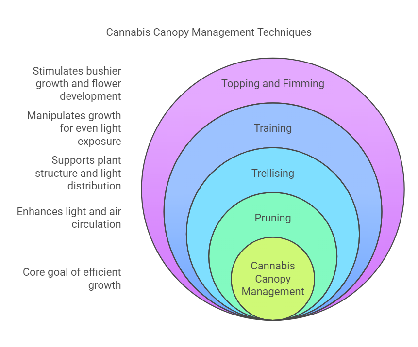 Pruning, trellising, Low-Stress Training (LST), Screen of Green (ScrOG), topping, and fimming are suitable for cannabis canopy management.
