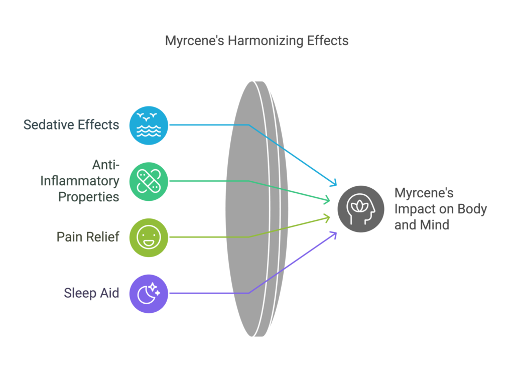 When you consume cannabis with high myrcene levels, you might experience sedative effects and anxiolytic effects. Some anecdotes suggest myrcene can make you sleepy, while others highlight its analgesic effects to ease discomfort.