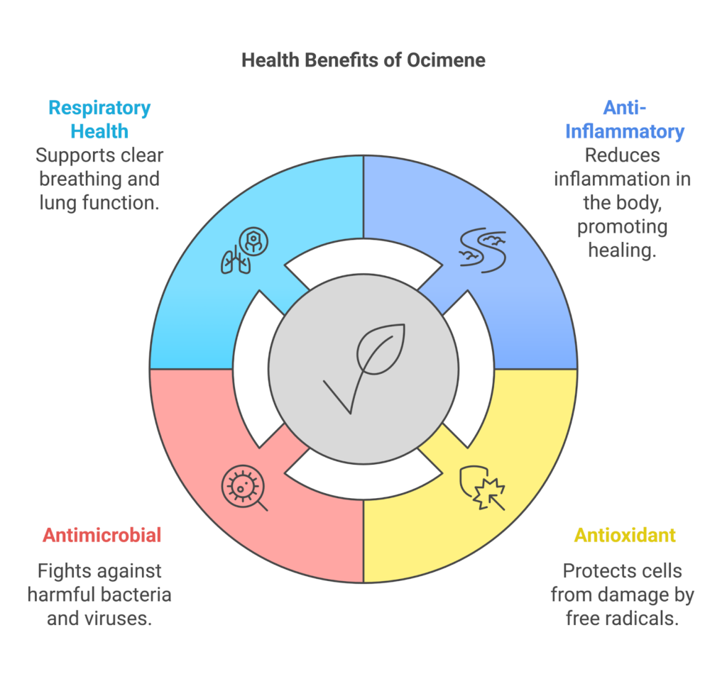 - Research suggests it may inhibit enzymes associated with bodily inflammatory substances, supporting the idea that ocimene has anti-inflammatory and antioxidative properties.