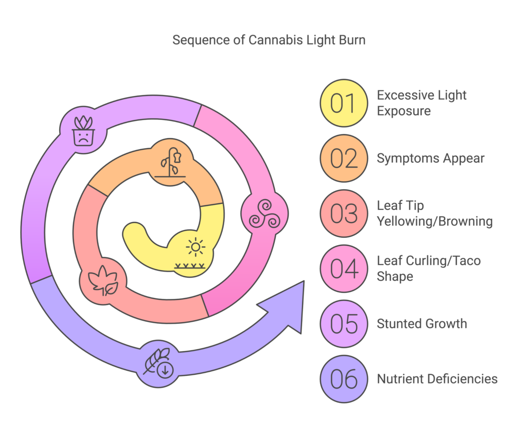 - Light burn symptoms include yellowing leaves, brown spots, and slowed growth, especially during the vegetative stage.