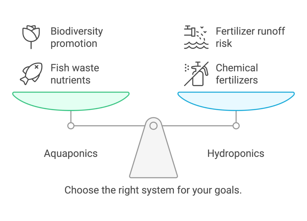 • Environmental Impact: Aquaponics promotes biodiversity and reduces waste, while hydroponics increases fertilizer runoff.