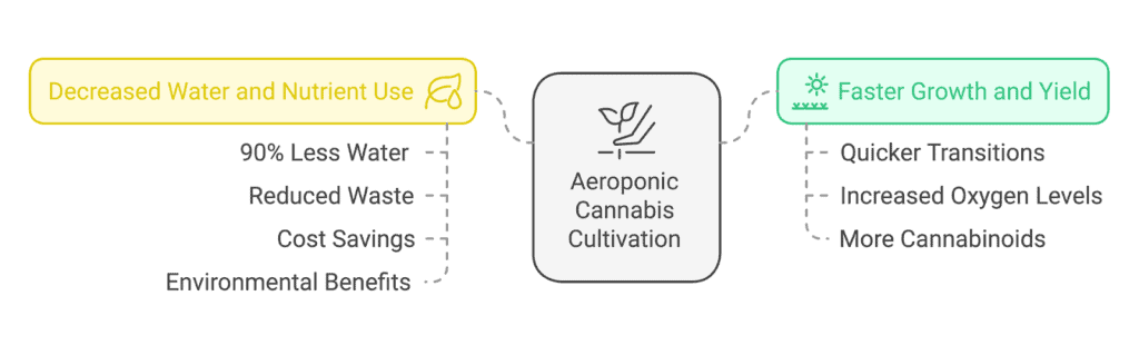 Aeroponics benefits cannabis cultivators since it promotes rapid growth and resource efficiency, making this method appealing to both rookie and experienced growers. The main benefits of aeroponic cannabis growth are: