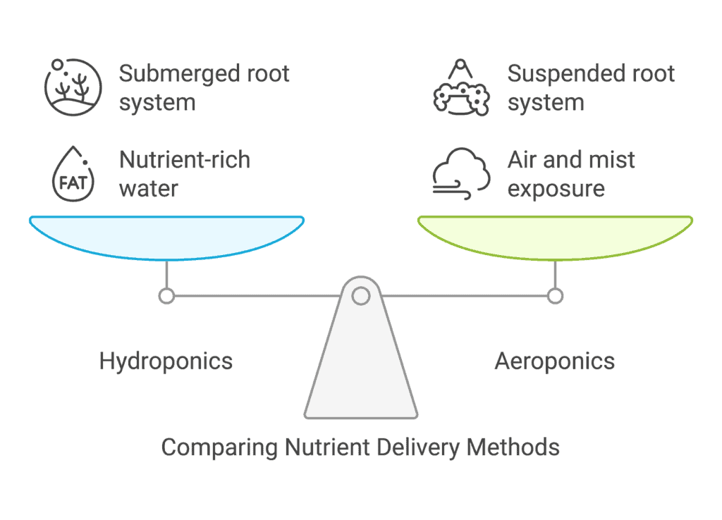However, aeroponics suspends roots in the air and sprays them with water-nutrient solution regularly. Oxygen exposure gives roots more air, accelerating growth. Both methods eliminate soil, but aeroponics optimizes oxygenation more actively.