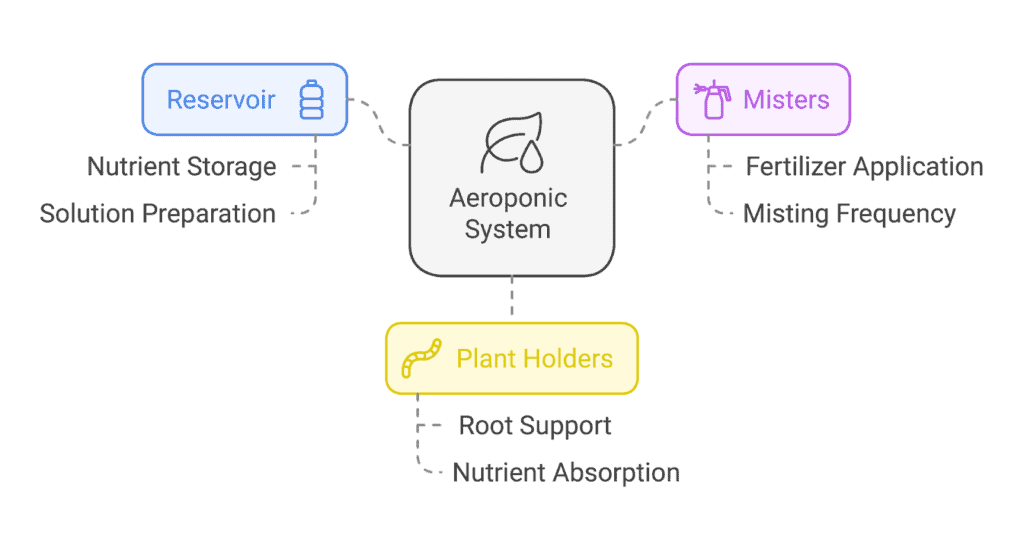 Aeroponic systems improve growth and efficiency using several elements. The most crucial part is the mist delivery system, which sprinkles plant roots with nutrients.